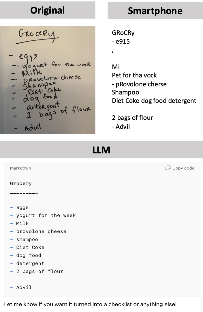 LLMs, however, can leverage context clues—both visual, such as whether the image is a list or a handwritten note, and textual, like the words surrounding a specific term—to more accurately interpret what the word is and predict what might come next.